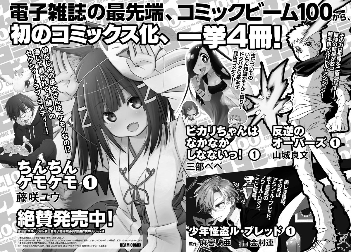 デジタル増刊 コミックビーム100 発 初のコミックス4作品 3月28日同時発売 反逆のオーバーズ 1 ちんちんケモケモ 1 少年怪盗ル ブレッド 1 ピカリちゃんはなかなかしなないっ 1 Kadokawa