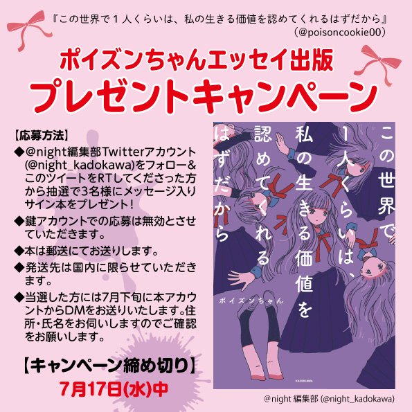 ポイズンちゃん 私の初書籍 この世界で1人くらいは 私の生きる価値を認めてくれるはずだから のプレゼントキャンペーンを開催します このツイートをrt Night Kadokawa フォローで応募完了 裏表紙にメッセージ付きです たくさんのご応募お待ち